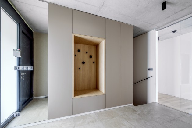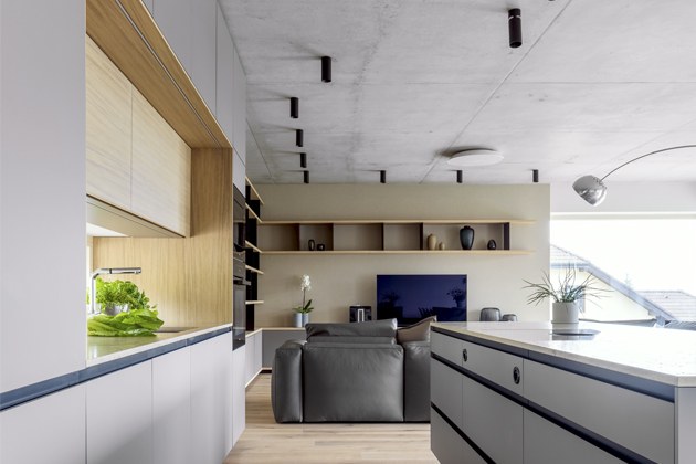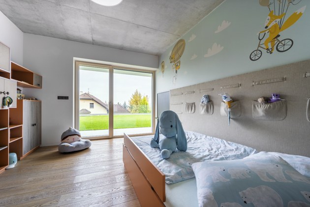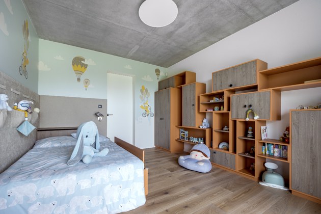 Na ploše zhruba 200 m2 bylo možné ještě vytvořit prostorné vstupní zádveří, velkou technickou místnost, dlouhou chodbu se spoustou úložných prostorů, dvě koupelny, WC místnost a dva dětské pokoje. „Jeden ze dvou ještě nedokončených pokojů bude sloužit také jako místo pro hosty a pracovna,“ dodává majitel domu. „Věděli jsme, že bychom nikdy nedokázali interiér domu tak dobře zvládnout jako profesionál. Náš projektant nám doporučil Jaroslava Harmáčka ze studia Concept Store Karlín, s nímž jsme začali spolupracovat dříve, než se koplo do země, měl volné ruce. Přáli jsme si například použít pohledový beton a vytvořit kontrast teplou dřevěnou podlahou nebo v kuchyni použít kámen,“ vzpomíná pán domu.