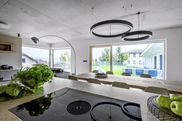 Najít na okraji jihočeského města rovný pozemek, který by splňoval nároky manželů, nebylo jednoduché, přestože jsou oba zdejší rodáci. Po velmi intenzivním hledání nakonec došlo k návštěvě jednoho inzerovaného místa, které bylo už déle na prodej. A jak už to někdy bývá – odříkaného chleba největší krajíc! Výhled z vyvýšené parcely mladý pár zaujal natolik, že se pro ni rozhodli. Atraktivní domov mladé rodiny, prostírající se v jednom podlaží, nakonec vyrostl v rovině, ale přesto ve svahu. Projektant navrhl řešení s opěrnou zdí, které umožnilo přímou návaznost prostorné terasy a zahrady v rovině, odkud je krásný výhled do okolí. „Inspirovala nás vila v Rakousku, kam jezdíme často na výlety a býváme tam ubytovaní. Chtěli jsme rovnou střechu,“ říká majitel moderní stavby. Ve svých představách a tužbách se partneři skvěle shodli a vzájemně podpořili. Oba si přáli vytvořit otevřený a dostatečně velký společenský prostor – propojenou kuchyň s jídelnou a obývací částí. „Přáli jsme si velký stůl, abychom se kolem mohli posadit s celou rodinou, aby se nikdo necítil stísněně, ale naopak všichni komfortně.