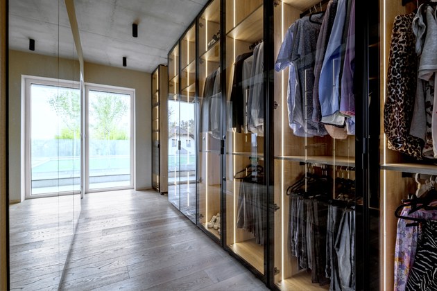 A tak se stalo! Šatna navazuje přímo na ložnici a současně i na koupelnu. Má přísun denního světla z obou stran. Opticky ji pomáhá prosvětlit i obrovská zrcadlová stěna. Všechny úložné prostory jsou řešeny velmi prakticky pod uzavřením kouřových skel, aby se na oděvy neprášilo, ale zároveň bylo patrné, co je kde uloženo.