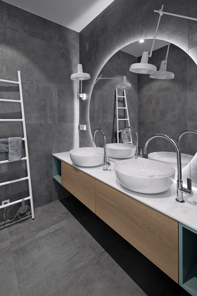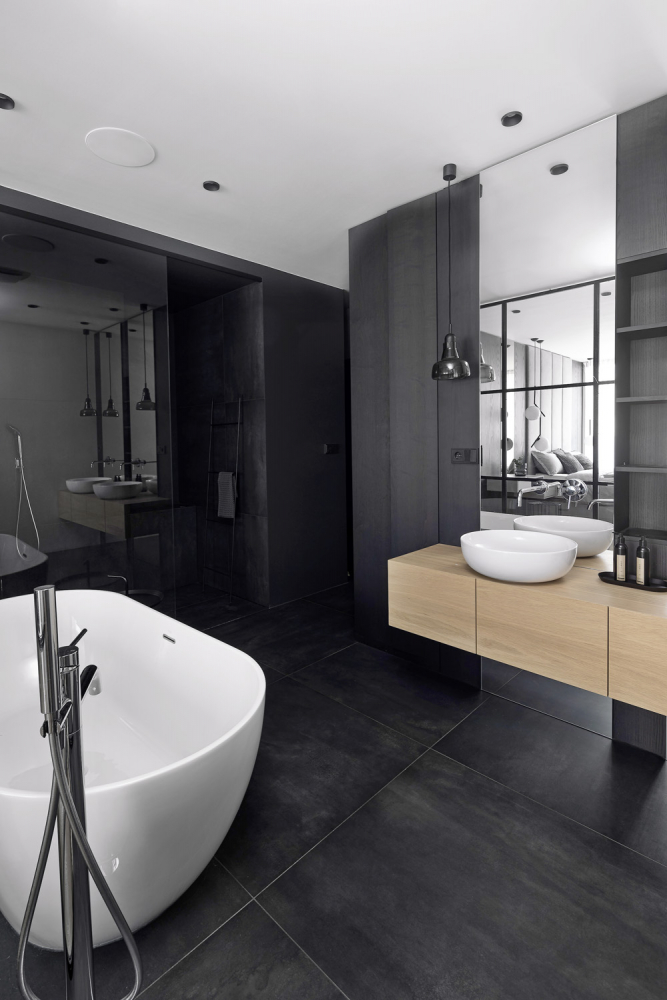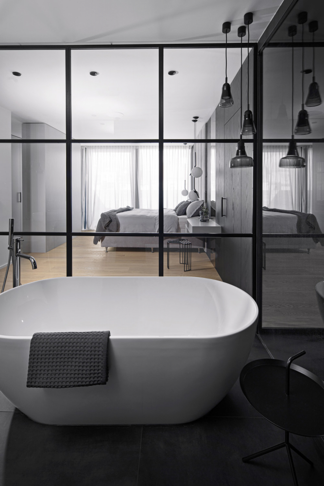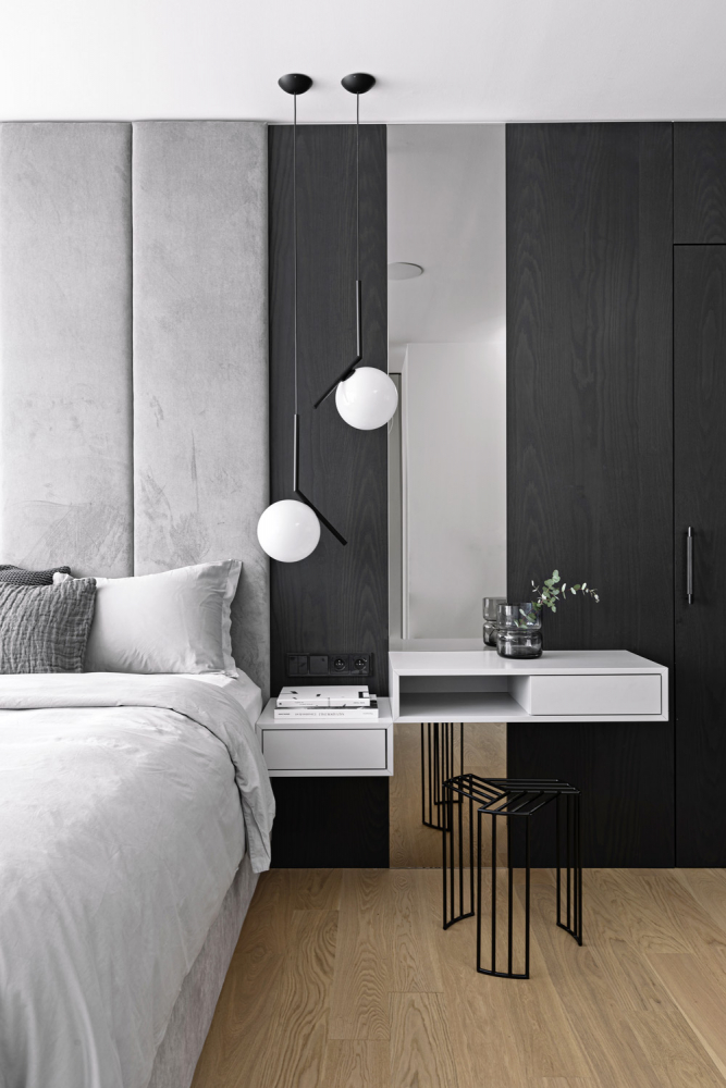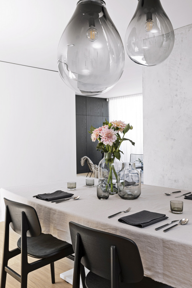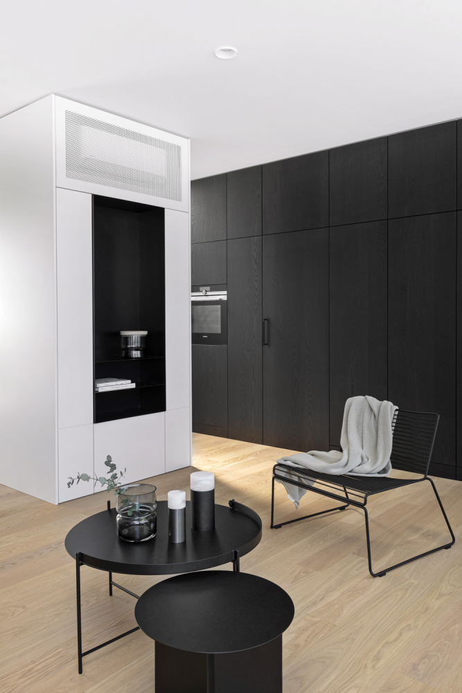 Barevnost se odráží od světlého odstínu dřevěné podlahy s matnou povrchovou úpravou, která prostor výrazně prosvětluje a umožňuje využít kontrastní tmavě mořenou dýhu na některé vestavné části nábytku. Výrazná kombinace velkých bílých ploch a černých konstrukcí solitérního nábytku tvoří zdánlivě ostrý základ, který vedle pocitově teplé dubové podlahy dostatečně zjemňují také odstíny šedé, využité především na textiliích v podobě čalounění, povlaků na polštáře nebo plédů. Stejně sofistikovaný přístup je patrný u nábytku.