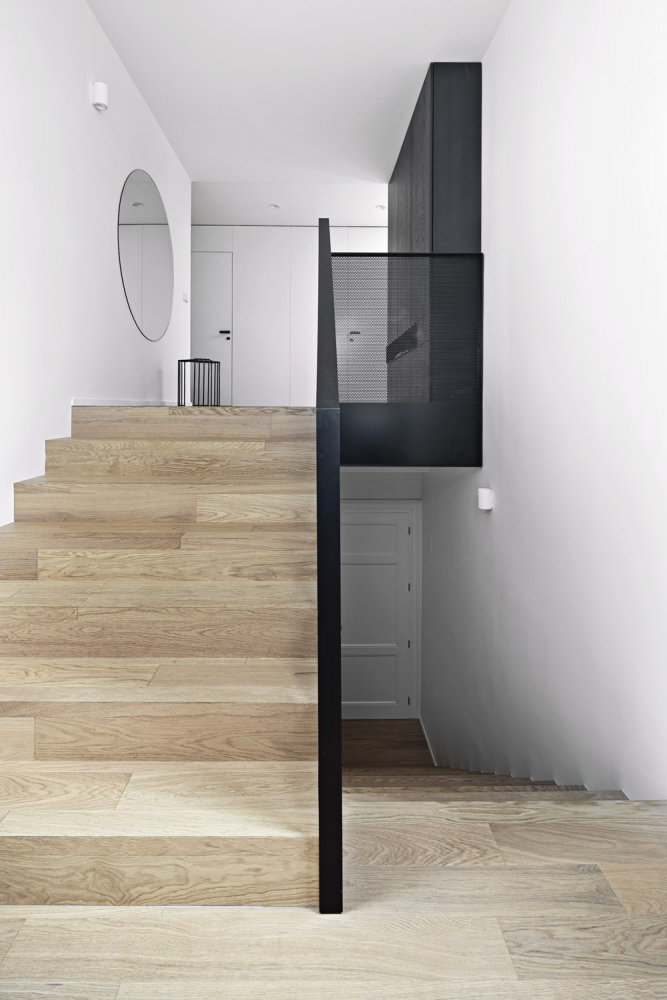 Oslovili proto studio Flat White: „Rozhodli jsme se pro razantní změnu dispozice. Vlastně jsme toho hodně vybourali, prostor očistili a otevřeli. Přestože nám v něm zůstalo plno komínů a různých světlíků, vznikl velký prostor, který jsme dobře využili a dostali světlo do každé části bytu,“ popisuje Ing. arch. Hana Davidová průběh náročné rekonstrukce.