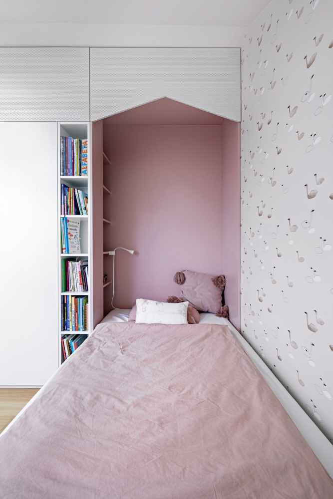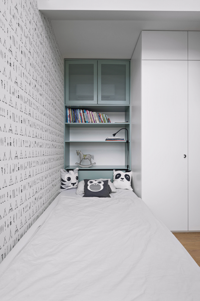 Ten byl z větší části vyroben truhláři na míru danému prostoru podle návrhu architektů, díky čemuž lépe vyniká několik typových kousků. Přestože je zde jasná převaha jednoduchých čistých linií a pravých úhlů, výsledek nepůsobí stroze ani ryze minimalisticky vzhledem k několika zábavným odchylkám a záměrným asymetriím. Těch je tu však přesně tolik, aby výsledek byl spíše harmonický než chaotický...