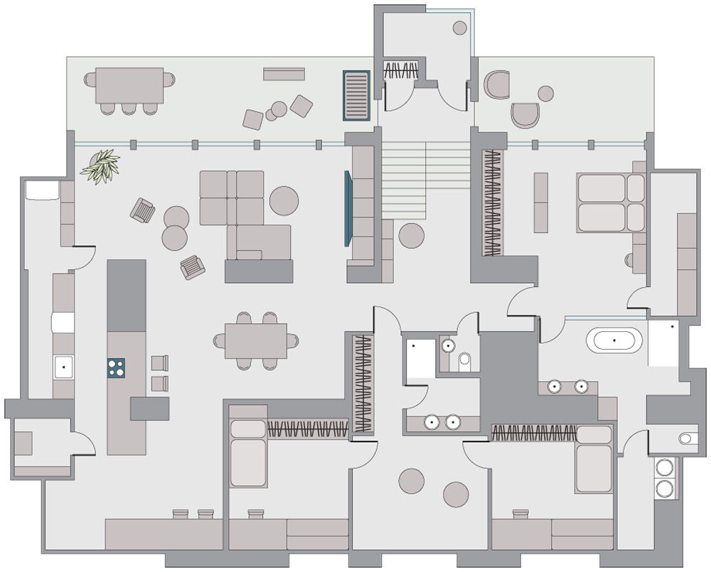 Součástí ložnice rodičů je koupelna s vanou pro relaxaci a dvě šatny. Potřebné zázemí v podobě technické místnosti, spižírny nebo prádelny jsou důmyslně ukryté tak, aby byt vždy vypadal uklizeně.