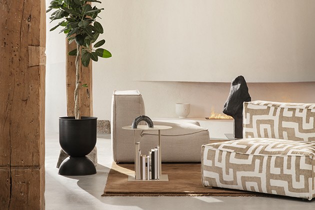 Modulární sofa Catena od výrobce Ferm Living vychází z tvarosloví sedacích vaků a je velkoryse dimenzováno především pro relaxaci. Oblíbený koncept nově obohatila výtvarnice Berit Mogensen Lopez výrazným abstraktním motivem a tlumeným barevným schématem použitým na čalounění.