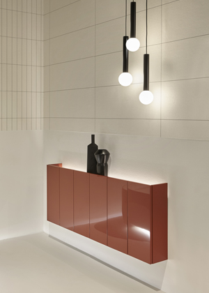 Skříňky Anima Liquida Living vypadají jako scénická kulisa, která spočívá u, nebo na zdi, jež nabízí různé možnosti povrchových úprav, barev a úložných variant. Boiserie/skříň vyhoví všem potřebám a je nabízena ve verzi s podlahovými nebo závěsnými moduly v různých šířkách, výškách a hloubkách, včetně verze 40 cm.