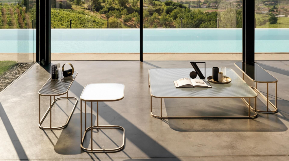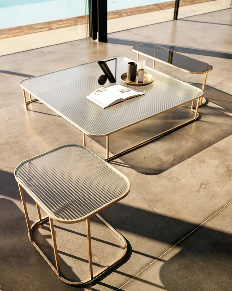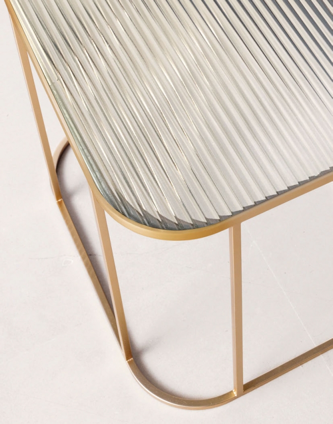 Deska je zabudována do horního rámu s oblými rohy, dodává se v různých barvách a jsou k dispozici leskle lakované, v hladkém nebo žebrovaném skle s elegantním texturovaným efektem. Podnoží je kovové matné zlaté. Design Matteo Thun & Antonio Rodriguez.