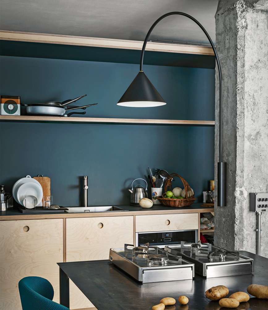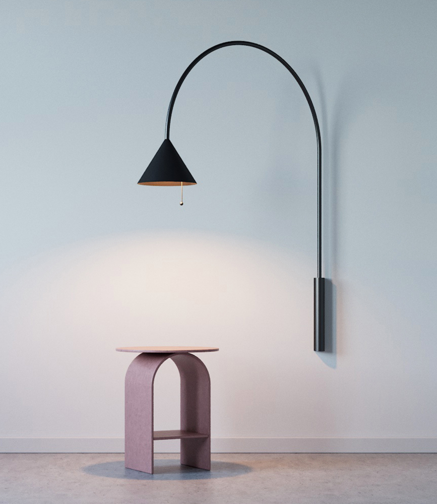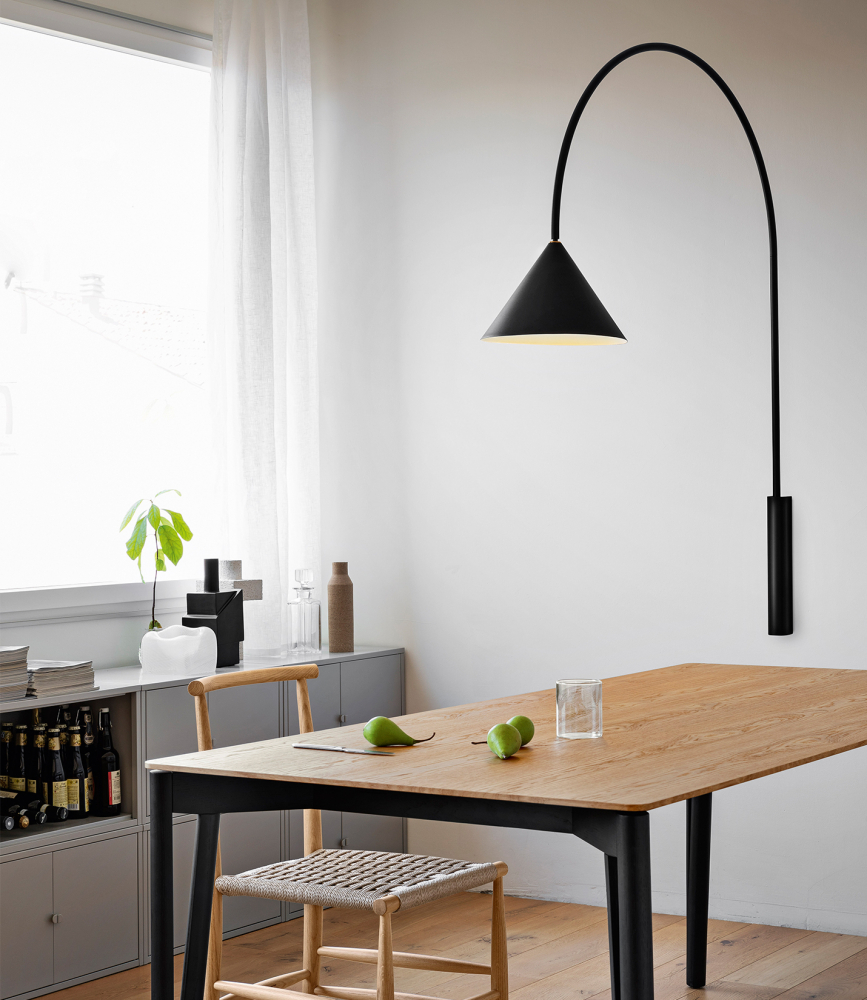 Elementární kónický tvar stínidla skvěle doplňuje konstrukci v podobě oblouku, která bezpečně dostane proud světla všude tam, kde na stolní nebo stojací lampu není místo nebo nálada.