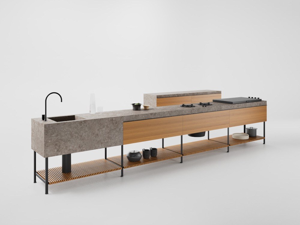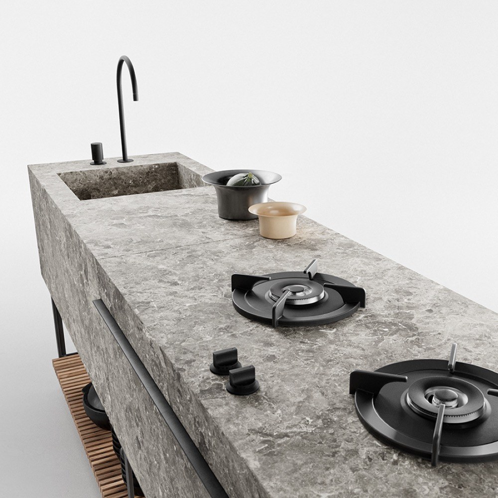 Modulární venkovní kuchyně Base Kitchen (Kettal) nabízí možnost vytvořit si vlastní sestavu podle individuální potřeby.