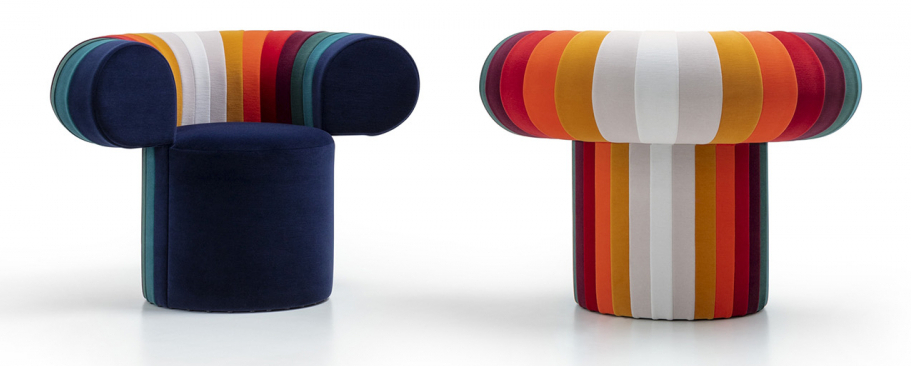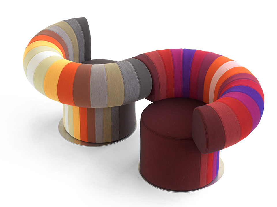 Křeslo má válcovou základnu a zakřivenou siluetu zakončenou polokruhovým opěradlem, k němuž lze připojit další kus. A pak další a další...