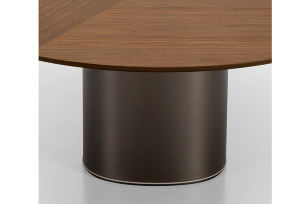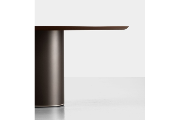 Pevná a sochařská základna z kovu je natřena novými povrchovými úpravami „Exclusive“, což je výsledek výzkumu v práškovém lakovacím centru Kristalia. Vrchní deska s kulatým nebo oválným organickým tvarem a zkoseným okrajem je k dispozici v provedení evropský dub, černě mořený dub a ořech nebo v černé či bílé Fenix-NTM nebo v mramoru Marquinia, Carrara, Emperador a Calacatta.