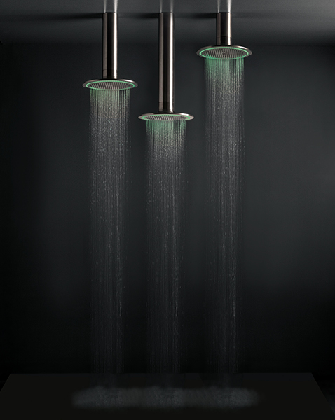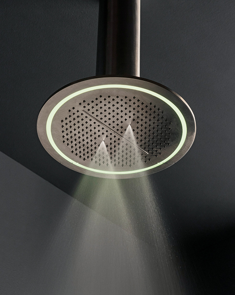 Pevná sprcha s tropickým deštěm, kaskádami i jemnou mlhou JK21 Mono (Zazzeri) je vybavena jemným LED podsvícením s nastavitelnou barevností a těžce avantgardním vzhledem.