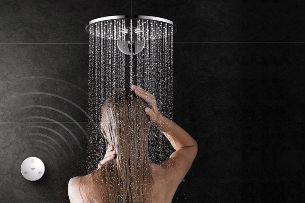 Jednou z takových novinek je revoluční způsob ovládání sprchy Grohe SmartConnect. Jde o bezdrátový dálkový ovladač, který umožňuje inovativní způsob ovládání. Hlavová sprcha Rainshower 310 je propojena s dálkovým ovladačem napájeným z baterie, který umožňuje přepínat mezi šetrným proudem PureRain a dynamickým proudem ActiveRain nebo je navzájem kombinovat.