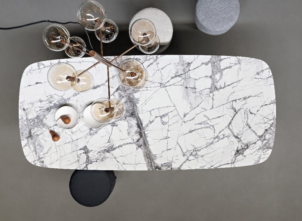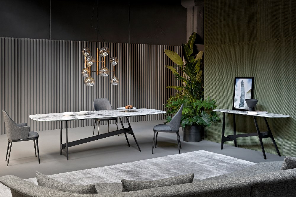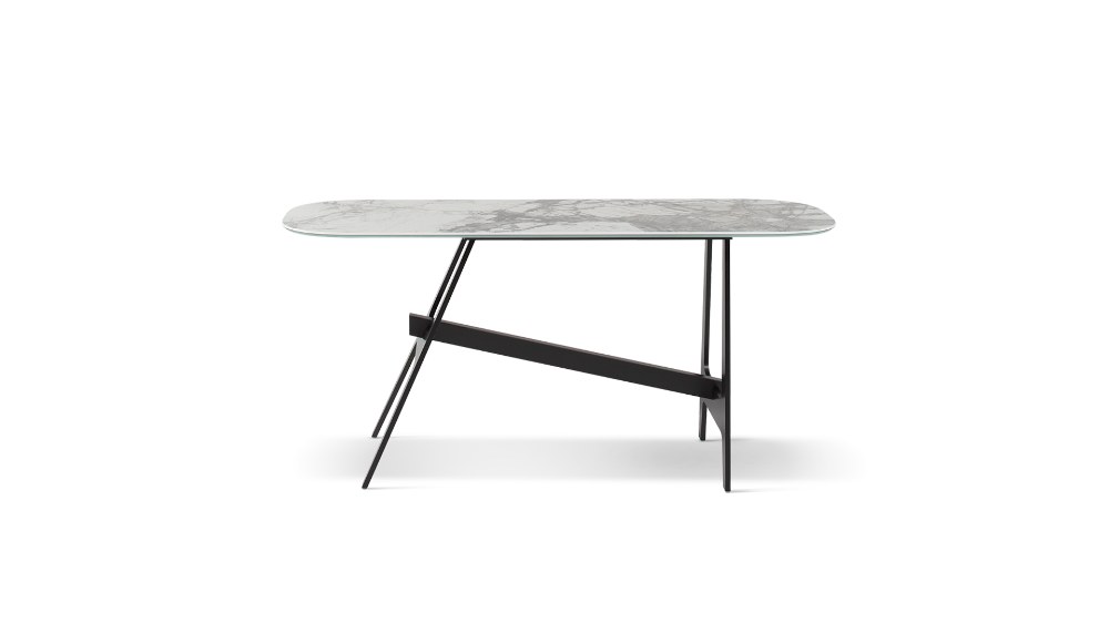 Hranatá konstrukce s příčným spojovacím prvkem přináší moment pohybu, a přitom kontrastuje se stabilitou pevné rovné desky stolu se zaoblenými rohy. Dostupné v několika velikostech a materiálech včetně masivního dřeva a mramoru v mnoha odstínech. Šířka 200, 250 a 280 cm.