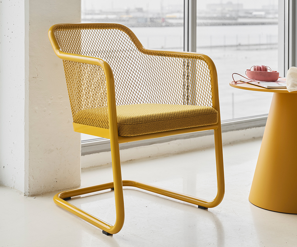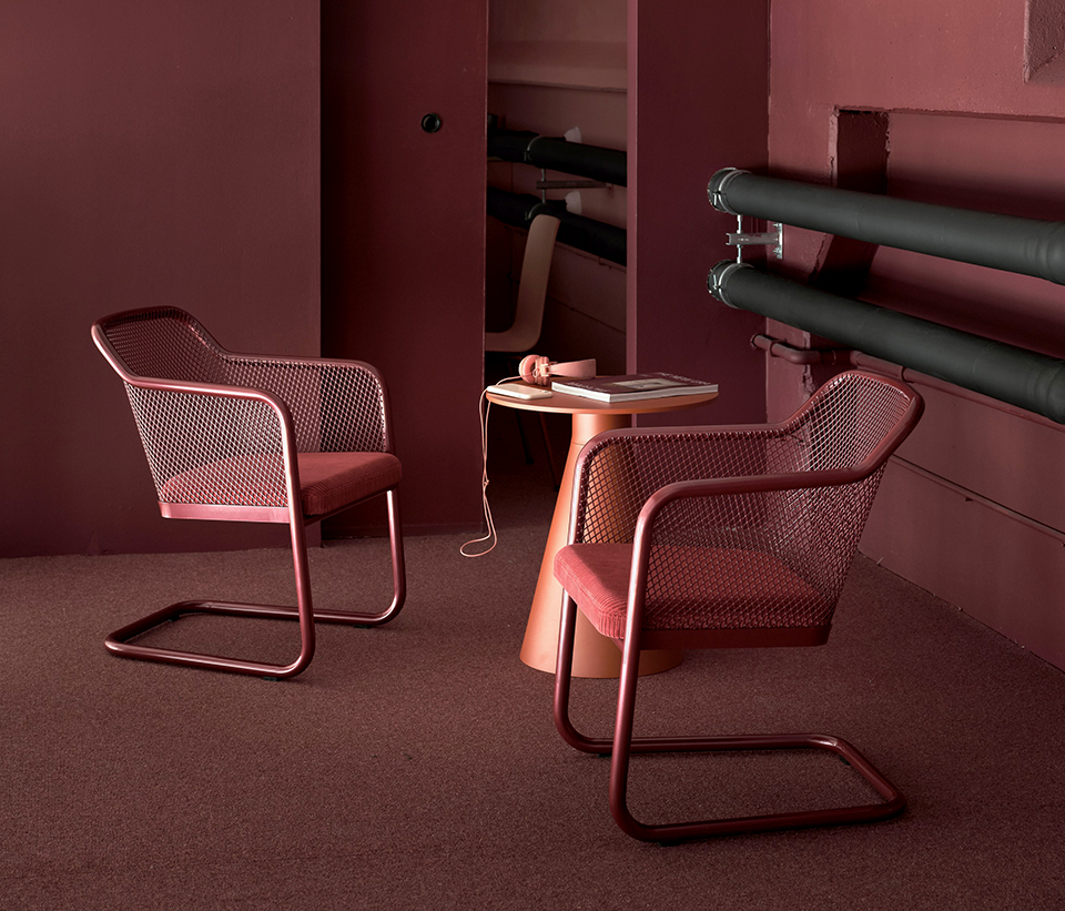 Kovový výplet slouží jako dostatečná opora zad a zároveň působí velmi subtilně. Maximální pohodlí zaručuje polstrovaný sedák.