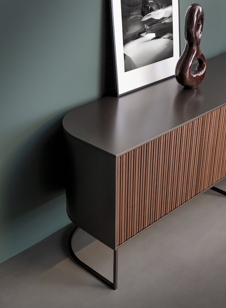 Asymetrická kovová základna, výrazné zaoblení hran a plastická struktura – tak by se dala ve zkratce popsat komoda Dune (Bonaldo). Zdroj inspirace je patrný, i když zapomeneme, jak se vlastně jmenuje.
