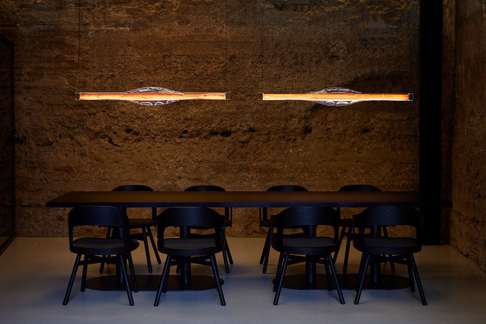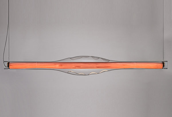 Speciálně ošetřená dřevěná dýha s certifikátem FSC je obalena jediným kusem borosilikátového skla, které ručně fouká proslulý sklářský mistr Eduard Garuti.
