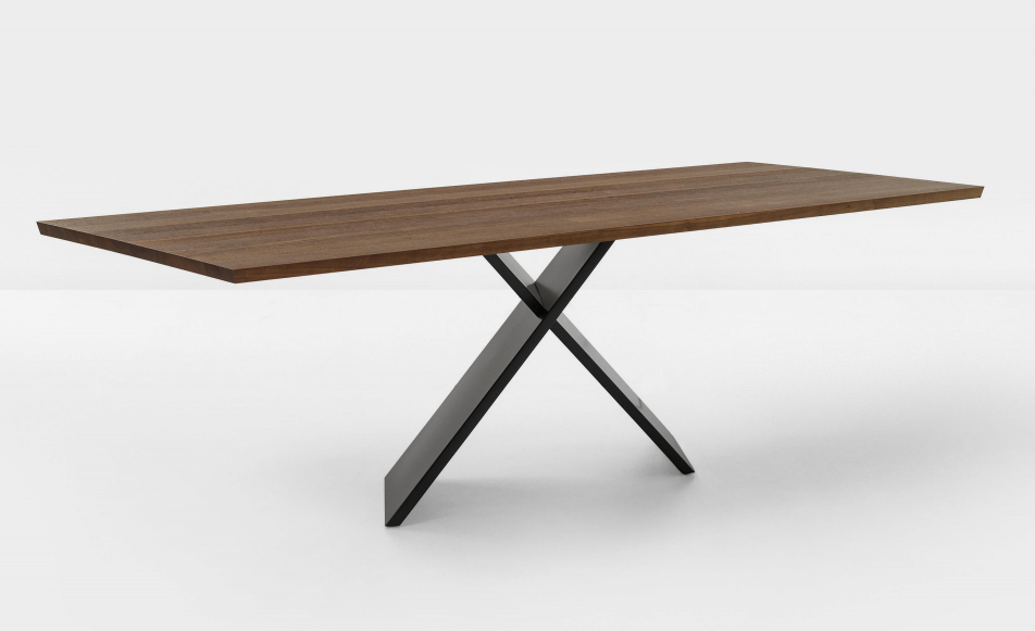 Stůl má čisté linie a výraznou jednoduchou konstrukci podnoží, která působí vzdušně a dynamicky. Originální konstrukce podnoží do písmena X se odrazila i v názvu.