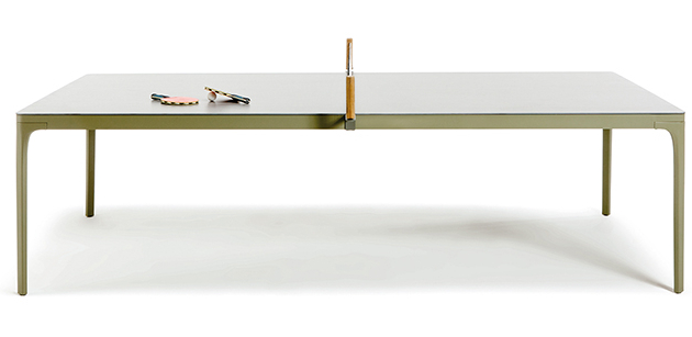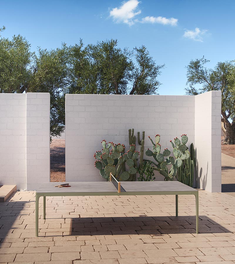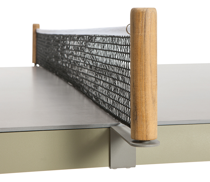 Hliníkové nohy stolu mají olivově zelenou barvu a keramická deska stolu je šedá. U stolu nechybí set na hru.