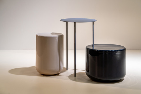 Subtilní vyšší stolek z matné práškově lakované oceli dobře doplňuje nižší masivnější stůl z glazované keramiky s lesklým povrchem.