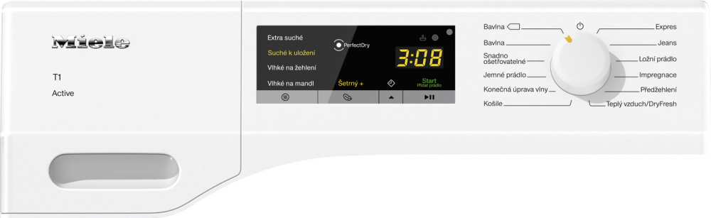Patentovaný systém snímání zbytkové vlhkosti PerfectDry zajišťuje na stupeň přesné sušení prádla a chrání tak například před přesušením, takže oděvy si déle udrží svůj tvar. Osvědčená technologie EcoDry pracuje s bezúdržbovým výměníkem tepla - a samozřejmě jako ztělesnění šetrné péče o prádlo obsahuje patentovaný voštinový buben Miele. Ani přidání prádla není problém: pomocí funkce AddLoad lze zapomenuté prádlo přidat i těsně před koncem programu - nebo je zase odebrat. Kdo bude chtít, může si textilie během sušení jemně provonět pomocí flakónů s vůní FragranceDos od Miele. Nový základní model pojme 7 kilogramů prádla a je vybaven pohodlným ovládacím systémem EasyControl s přímou volbou jednotlivých programů pomocí senzorových tlačítek.