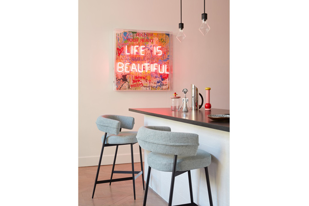 Barová židle s velkým vizuálním dopadem díky kontrastu mezi lehkým rámem a velkorysými obrysy čalouněných prvků.