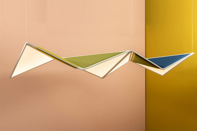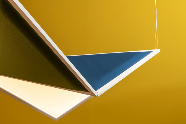 Světelné plochy střídají barevné textilní akustické panely v mnoha zakřiveních a sklonech, které je možné nastavovat a otáčet podle aktuální potřeby.