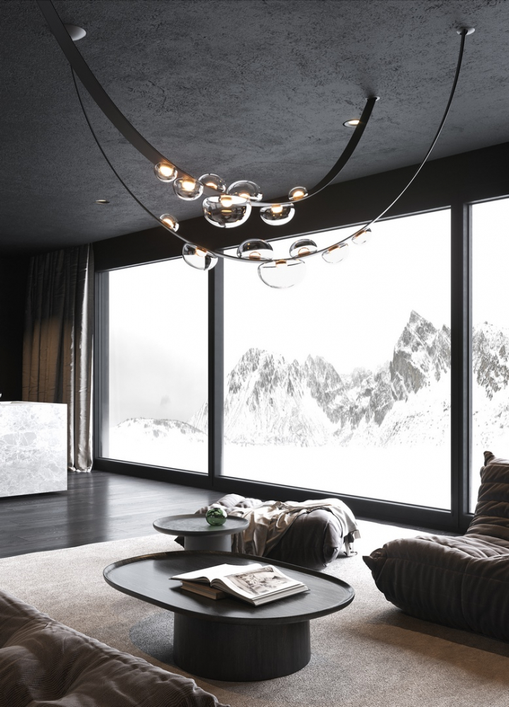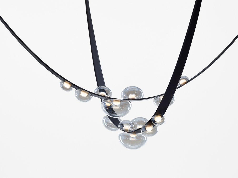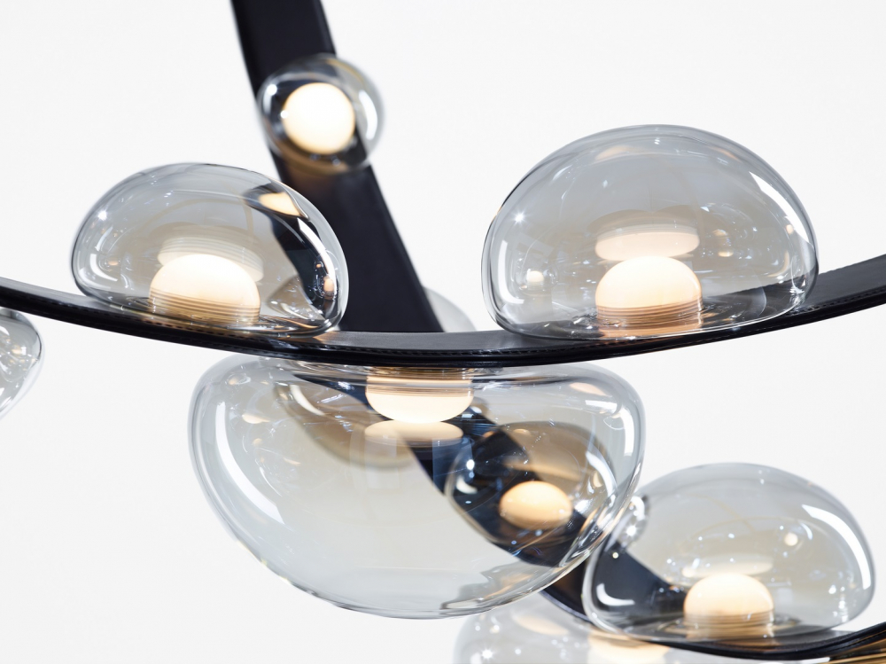 Křišťálové objekty s nádechem perleti dokonale přiléhají na ručně šité pásy z inovativního materiálu nebo vysoce kvalitní kůže a rozzářené vnitřním světelným zdrojem nabízejí mimořádný estetický zážitek. Kolekce Dew Drops překvapí variabilitou zavěšení v prostoru i možností utvářet jedinečné kompozice. Výsledkem je osobitá umělecká instalace, dominantní šperk interiéru oslňující z každého úhlu.