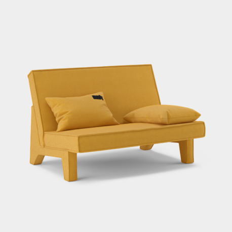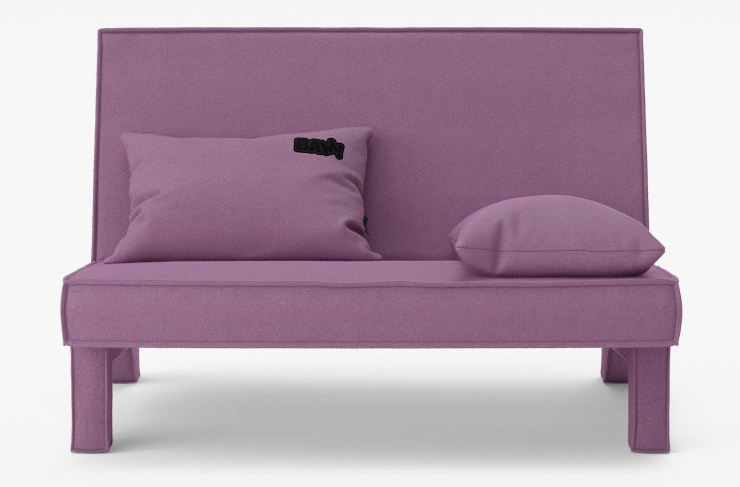 Konstrukčně je zredukována na zcela základní geometrii a za jejím grafickým profilem i homogenním vzhledem doslova stojí především nohy čalouněné stejnou textilií jako sedák a opěradlo.