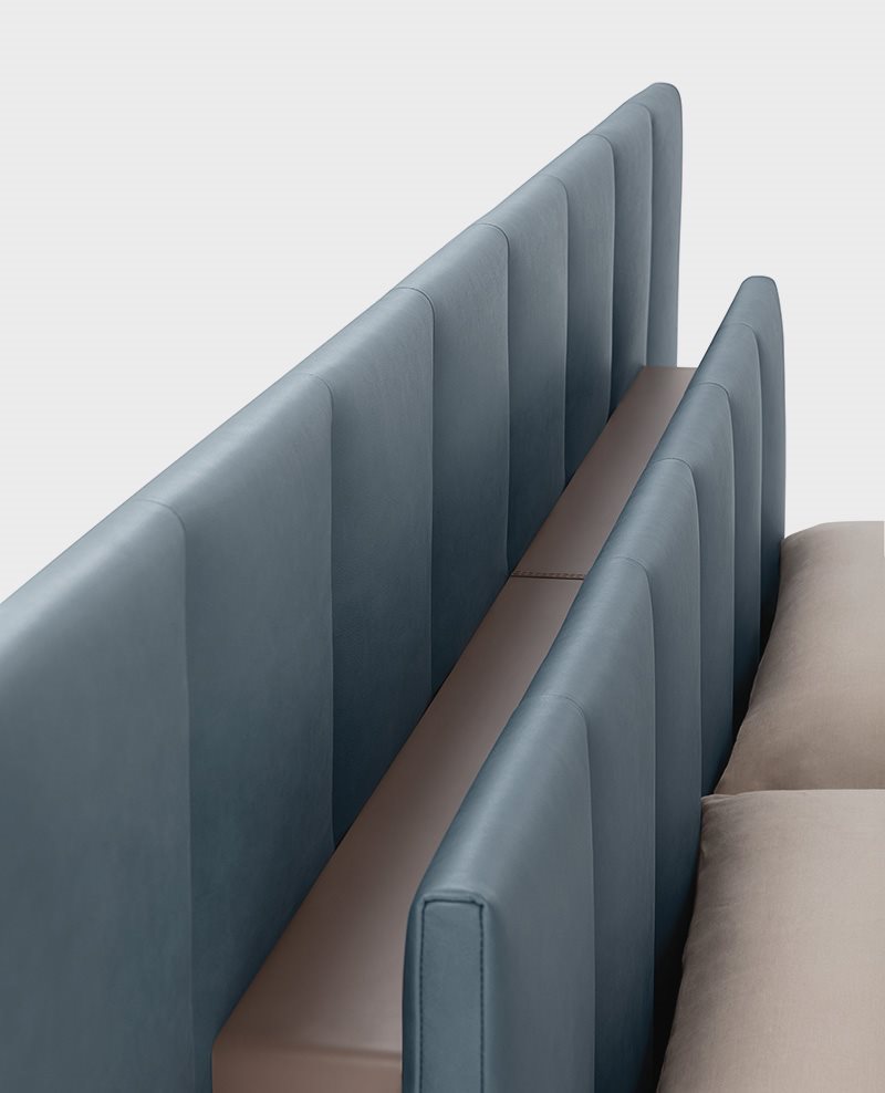 Kouzlo tohoto uspořádání přesahuje čistě estetický rozměr, protože mezera mezi dvěma čalouněnými panely byla zaplněna úložným prostorem.