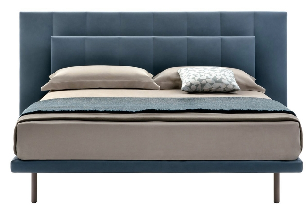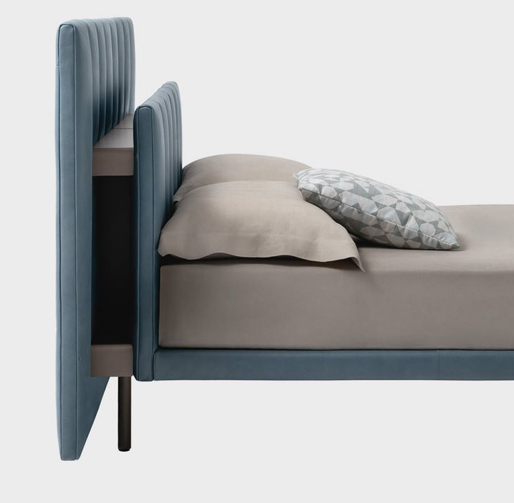 Postel Grangala italského výrobce Zanotta nabízí velmi vyváženou variantu postele, která díky svým dvěma samostatným čelním panelům různé velikosti vytváří plastický kontrast dvou rovin.