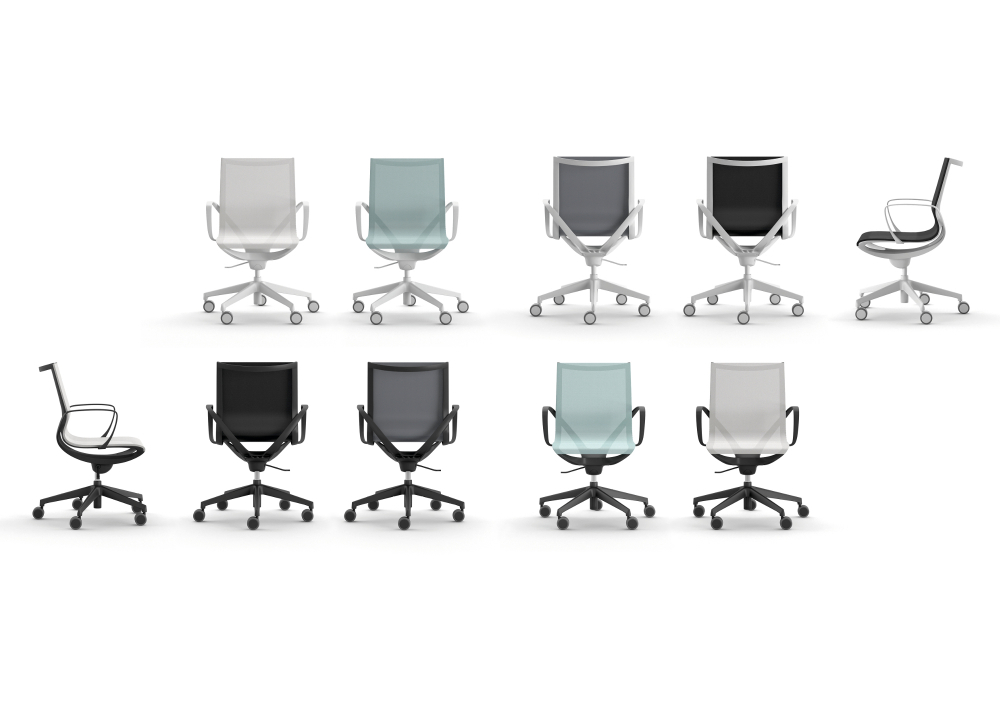 Vysoká možnost konfigurace je dále možná především ve výběru podvozků z různých materiálů a samozřejmostí je také plynový píst s regulací výšky. Dle přání je možno židli vyrobit jak v čalouněné variantě, tak i ve variantě se síťovinou.
