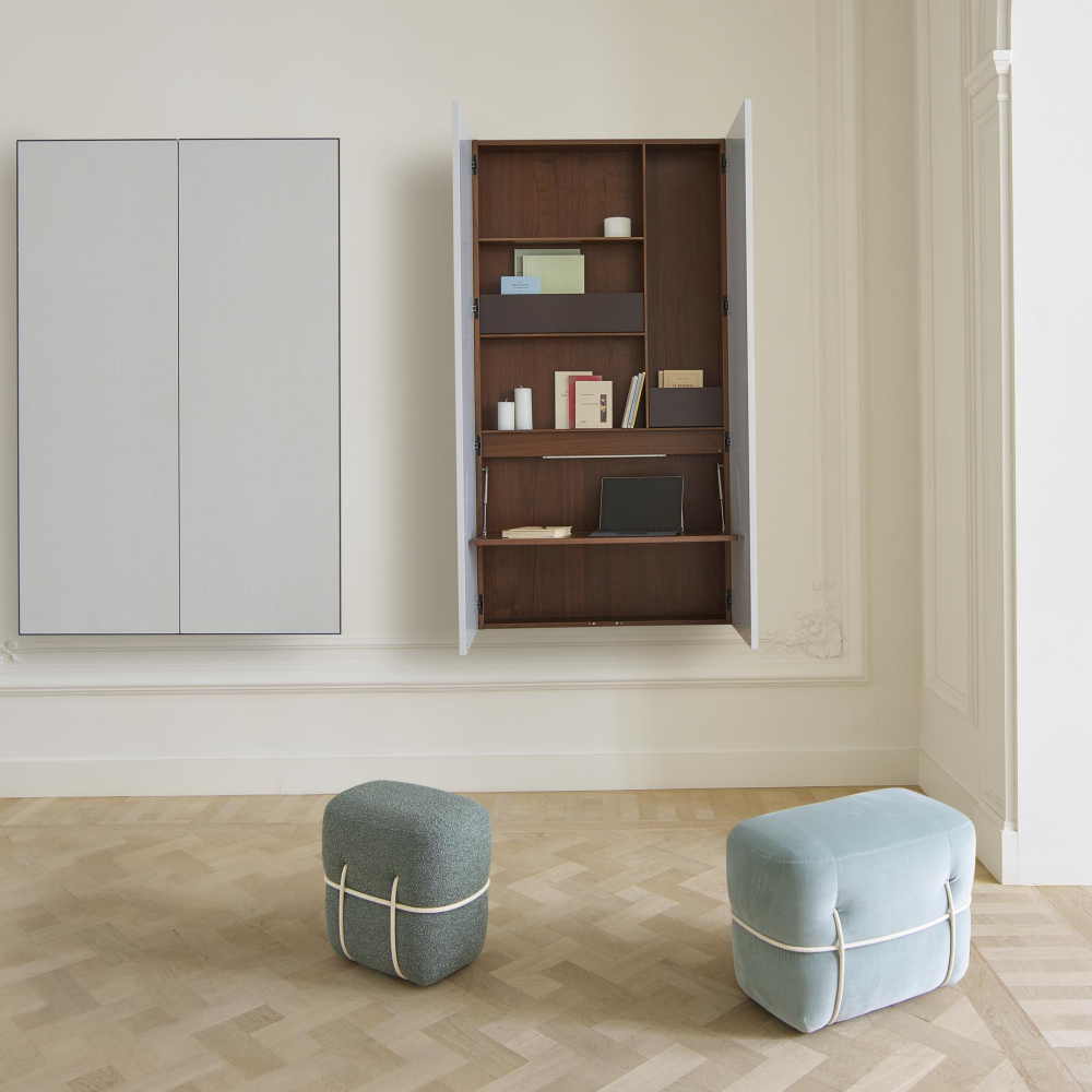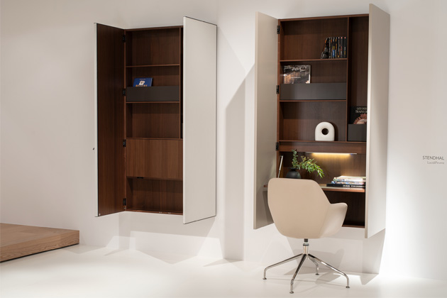Stendhal (Ligne Roset) je nástěnný sekretář ukrývající sklápěcí desku stolu, dostatek úložných prostor i dobře skryté umělé osvětlení.