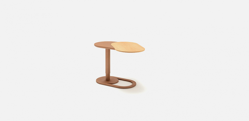 Dřevěná deska odvážně vystupuje ze zdánlivě nedotknutelného pravidelného oválu, který tvoří konstrukci z lakovaného kovu.