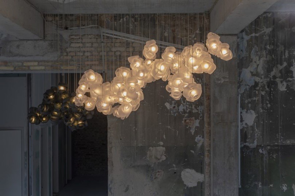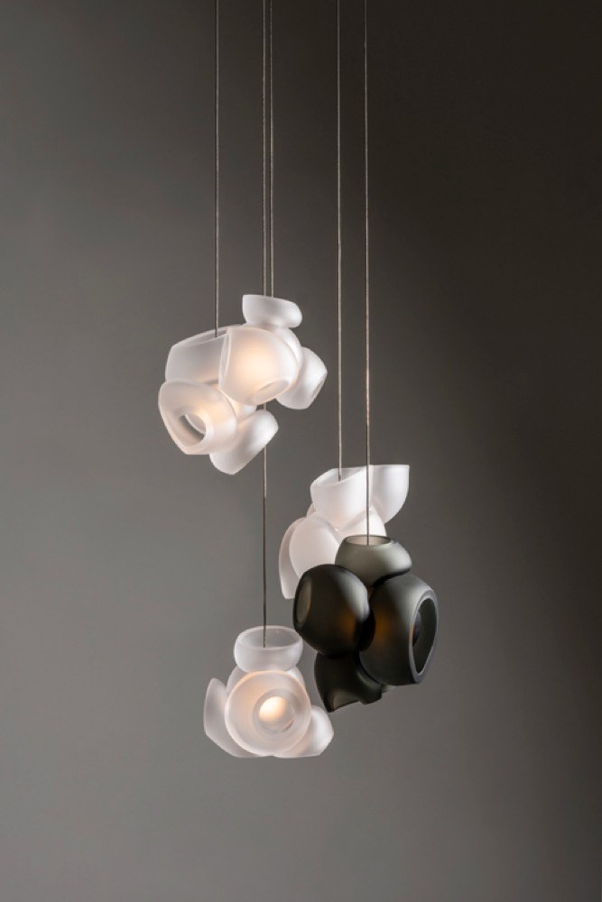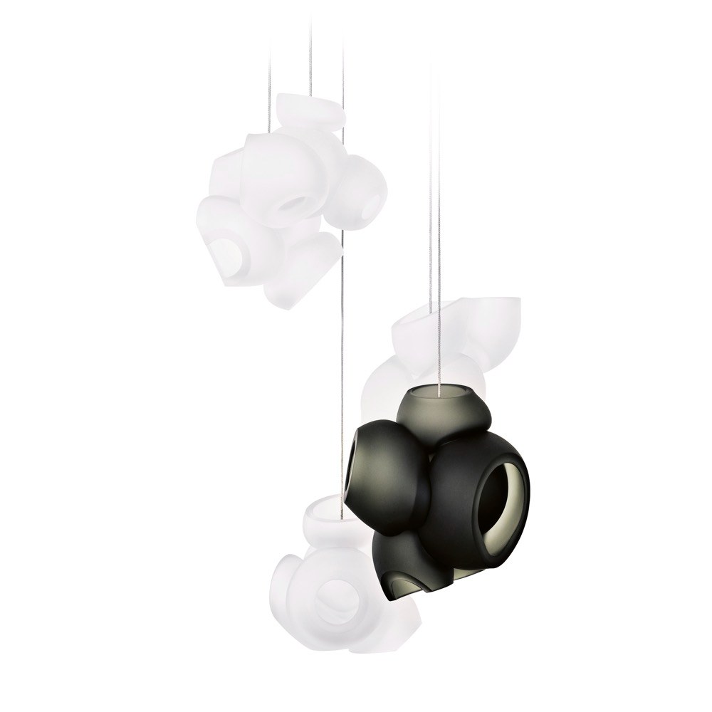 Nevyužité roztavené skleněné bubliny připravené několika sklářskými mistry jsou poskládány dohromady tak, aby vytvořily nepředvídatelné do sebe zapadající formy stínidla. Svítidlo je dostupné v matné povrchové úpravě za cenu od 20 790 Kč, WWW.BULB.CZ