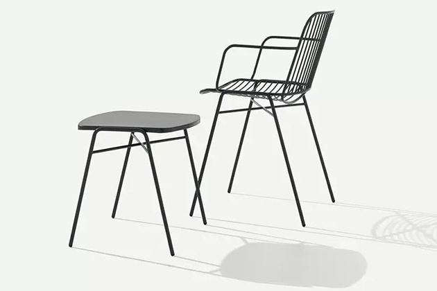 Rám židlí je vyroben z odolné oceli a je dostupný v široké škále barevných variant, včetně sofistikovaných neutrálních odstínů i výrazných designových tónů. Pro venkovní použití lze židle doplnit voděodolnými čalouněnými polštáři z recyklovaných tkanin Reviva, které jsou k dispozici v několika barevných provedeních.