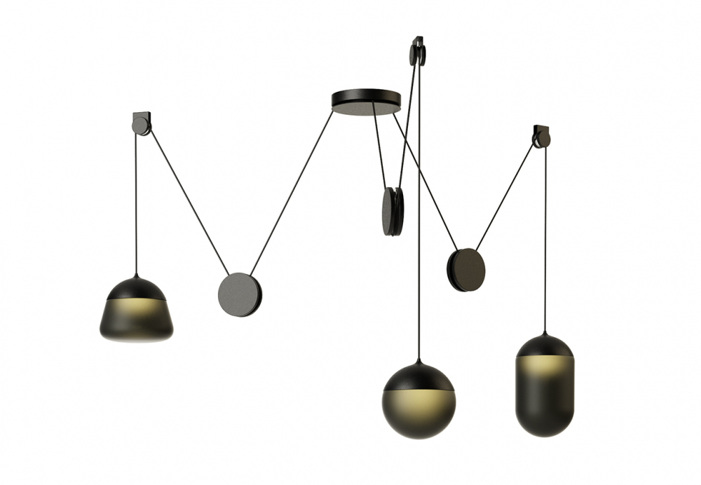 Jednotlivá svítidla lze variabilně uspořádat a za pomoci kladek a přesně kalibrovaných závaží jednoduše nastavovat jejich výšku. Stínidla z pískovaného skla doplňují kovové komponenty s matným povrchem a textilní kabel. Monochromatické barevné schéma podtrhuje grafický vzhled svítidla a zdůrazňuje elementární geometrii všech prvků, které jej tvoří.