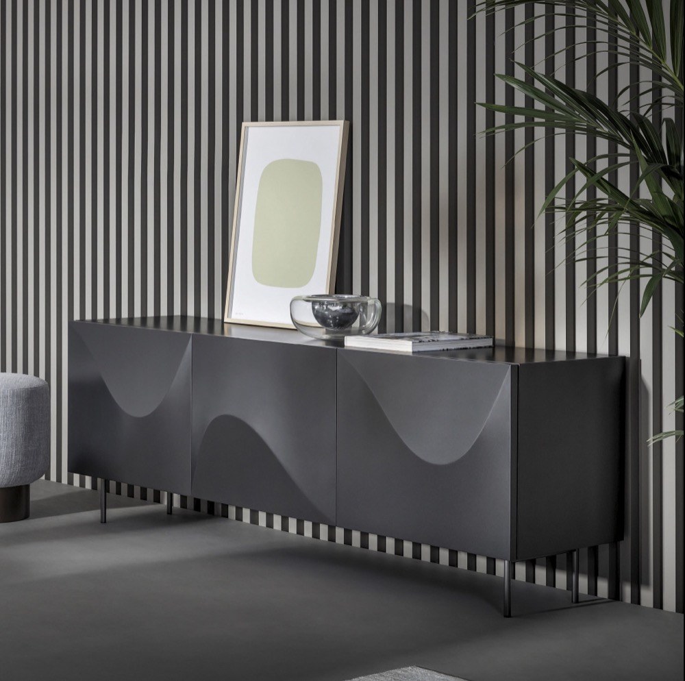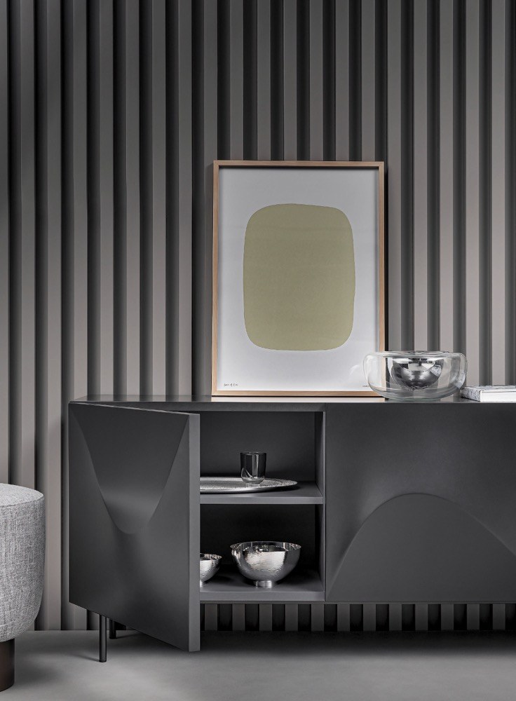 Inspirován plakátem ke slavnému filmu Alfreda Hitchcocka, příborník Vertigo (Bonaldo) okouzluje plasticitou vln, vytvářejících dojem pohybu na povrchu předních dvířek nábytku.