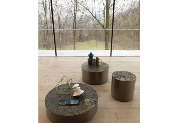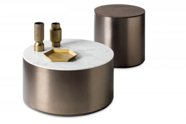 Tyto příležitostné stolky, připomínající pařez, jsou inspirovány přírodou: kovové, válcové tvary s mramorovou nebo dřevěnou deskou.