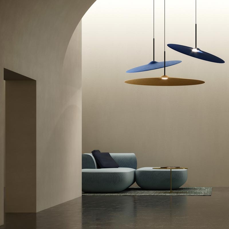 Vzhled závěsného svítidla Acustica (Fabbian) je inspirován činely, které bývají součástí bicích souprav.