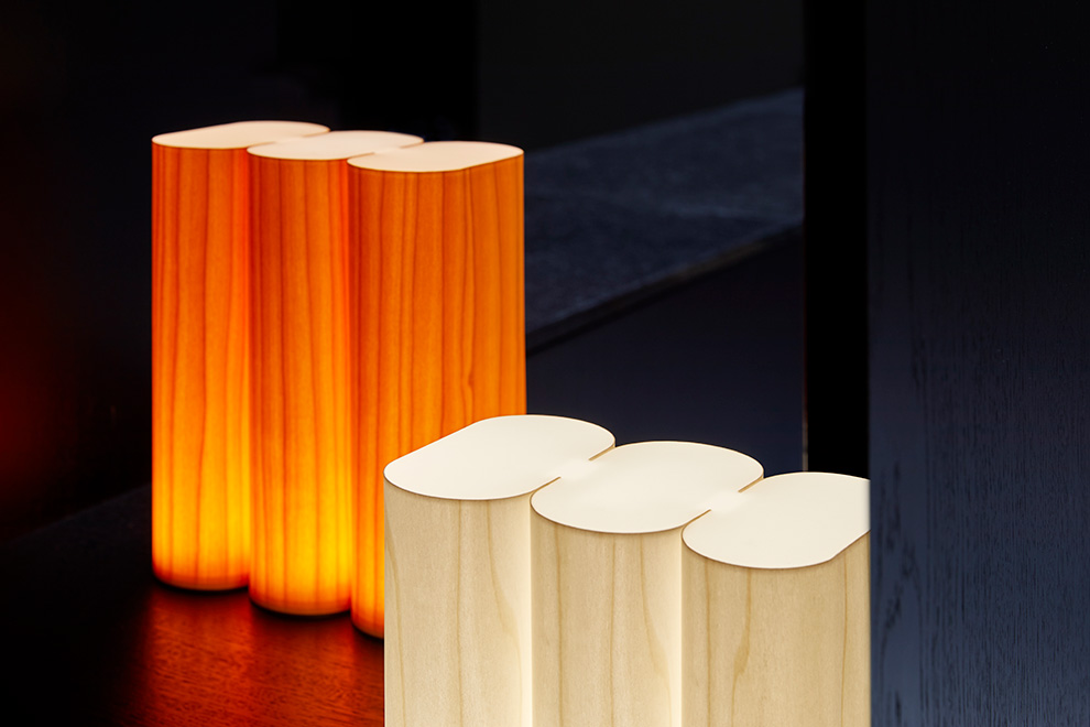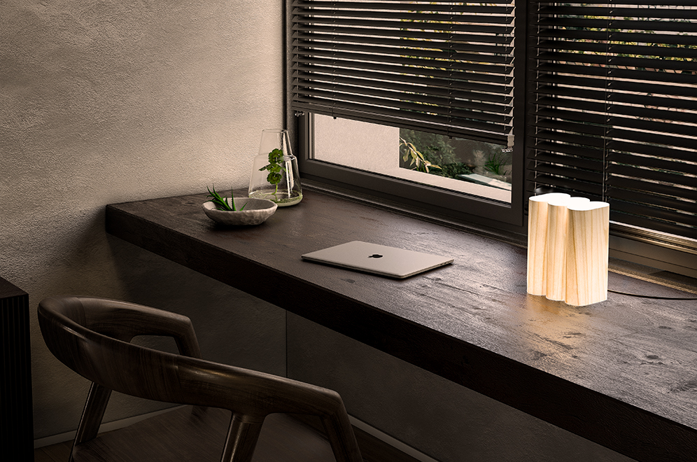 Vyrobeno je z dřevěné dýhy v závěsné a stolní variantě, součástí výbavy je stmívatelná LED dioda a jemný difuzor filtrující světlo.