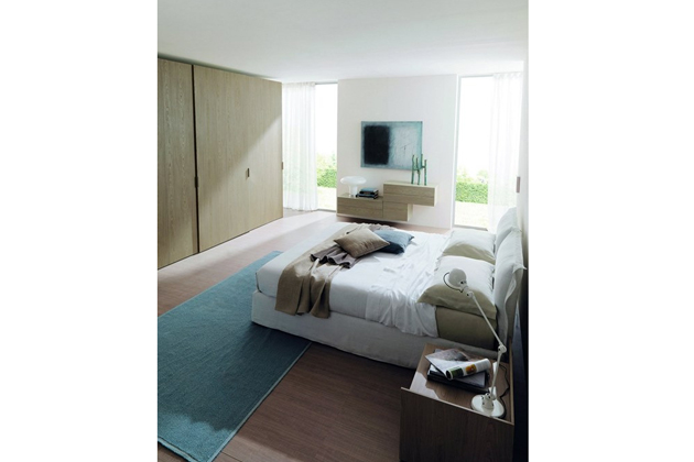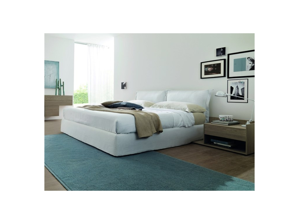 Rám z kovu a dřeva, nohy z černého polypropylenu, polštáře a záhlaví je naplněné kombinací peří a polyesterových vláken. Snímatelný potah v látce nebo kůži dle vzorníku.