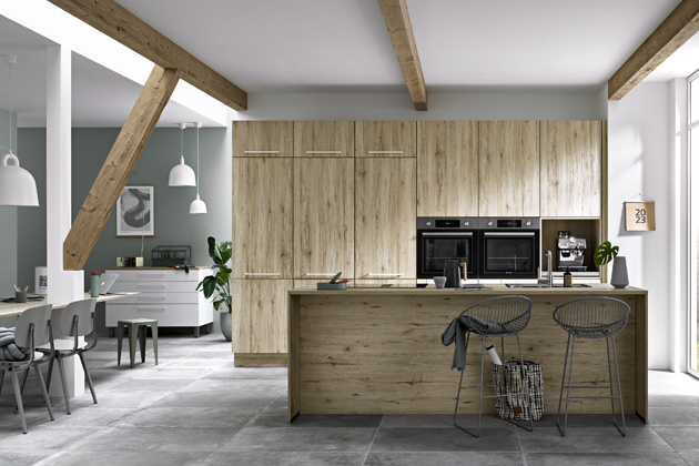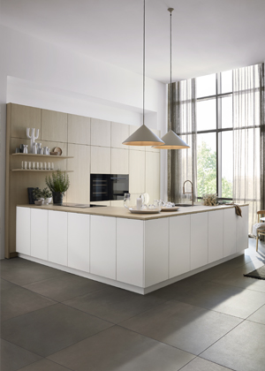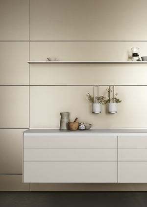 Foto: Nolte KüchenneoLeaf Sand Ash (Nolte Küchen), kuchyň s diskrétní úložnou stěnou, která pojala vestavěné spotřebiče i velkorysou spížovou skříň s výsuvnými policemi → www.nolte-kuechen.com