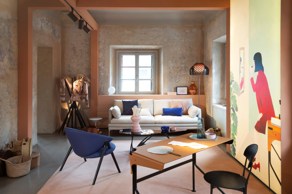 Jednoduchý ocelový matně lakovaný černý rám vytváří oporu pro tenký svršek z hovězí kůže vyrobený z jednoho kusu, který se lehce přizpůsobuje struktuře a ponechává některé části nekryté.