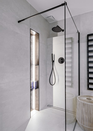 Jedním z prvků, který byl pro paní domu v koupelně velmi důležitý a jemuž se podřídilo plánování celého řešení, byla volně stojící vana. Tu si přála mít pod oknem, aby se v ní dalo při relaxační koupeli číst při denním světle. Umístění monolitického prvku ale prostor koupelny moc nenahrával. Vedle vany se totiž ještě musela vejít toaleta se zástěnou, takže se část podlahy za vanou, kde je umístěna baterie, stala nepřístupnou. To ale Radku neodradilo a společně s instalatérem vymysleli neobvyklé řešení, které umožňuje pootočení části vany směrem do prostoru, takže se dočasně vytvoří potřebný průchod. Stejně jako vanu si majitelé přáli zachovat v koupelně i sprchový kout, pro který se našlo místo u stěny naproti umyvadlům. Tvoří jej jednoduchá konstrukce typu walk-in s černými rámy, černě lemovaná nika a sprchový žlábek. Černé jsou taky všechny baterie a nástěnný radiátor. Zajímavě si Radka poradila s oddělením toalety, pro které využila dřevěné lamely, jež celek příjemně zateplují a ponechávají mu dojem vzdušnosti.