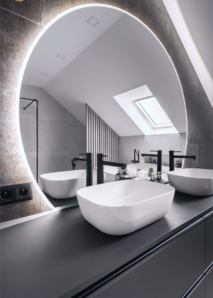 „Chtěla jsem zařídit koupelnu tak, aby tu byl dostatek úložných prostor a na desce u umyvadel se nic zbytečně nepovalovalo,“ zdůrazňuje Radka. „Proto nechala na desku ke stěně vedle umyvadel umístit ještě polici, ve které má každý z rodiny své vymezené místo.“