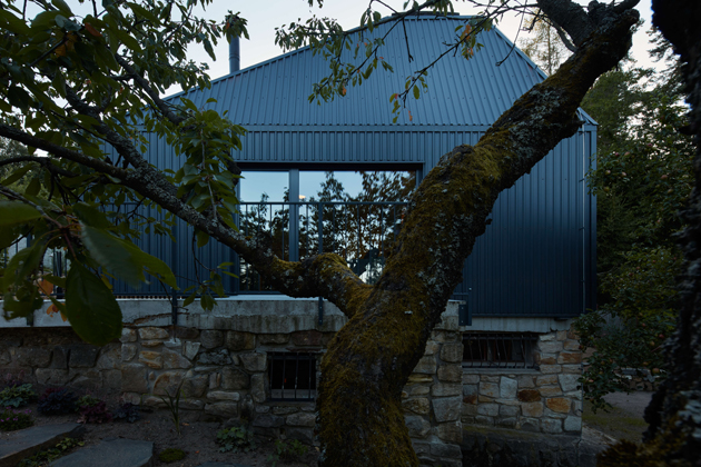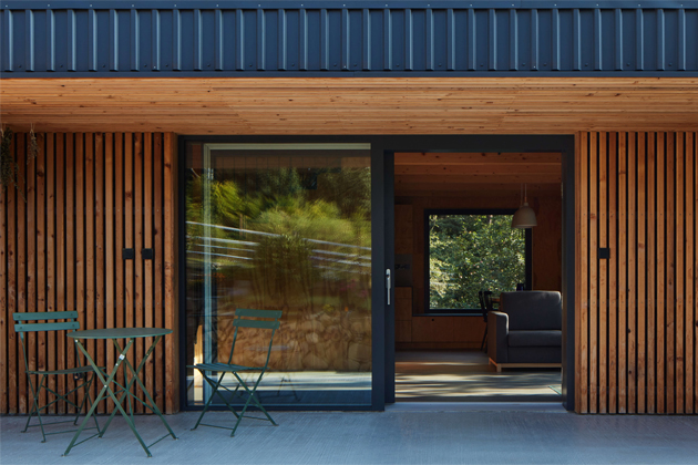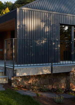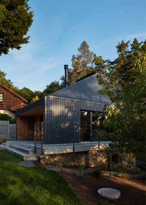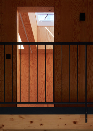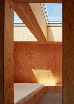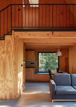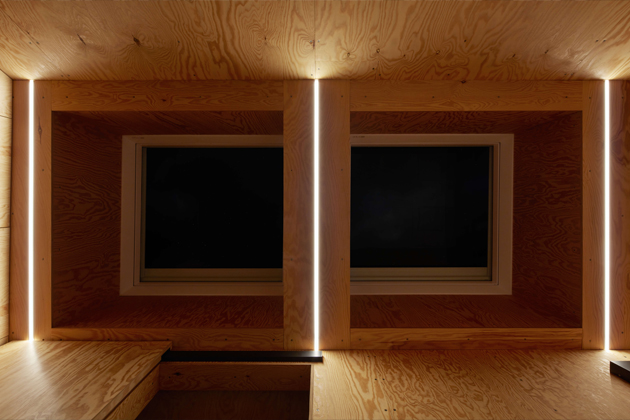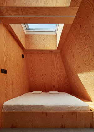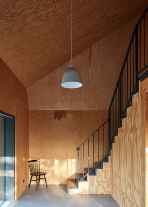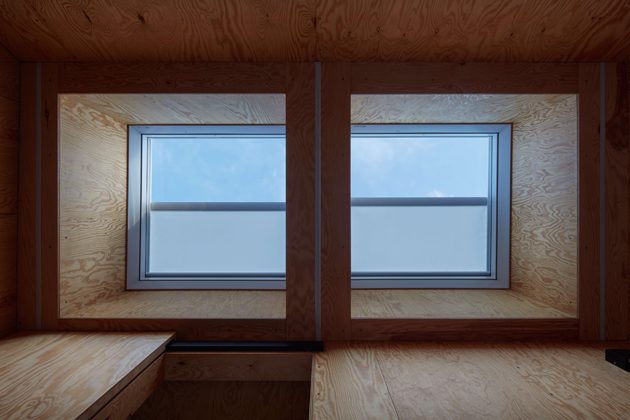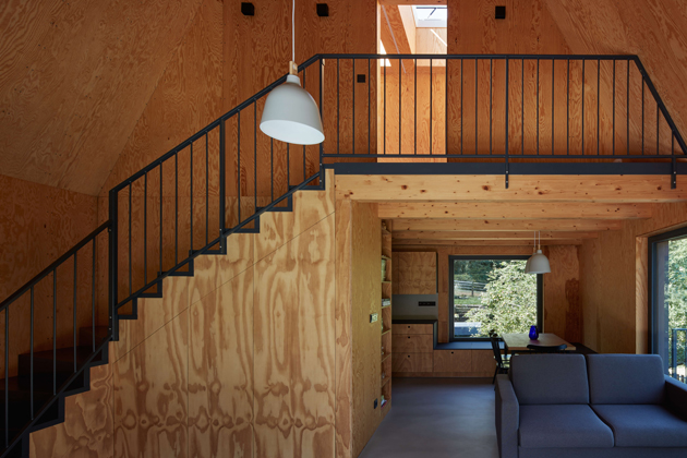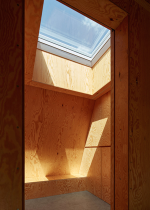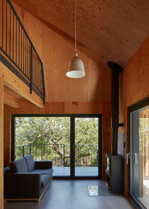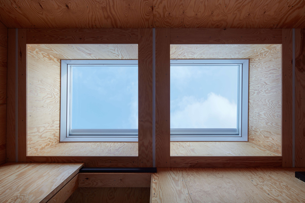 Z přízemí se otevírají výhledy do okolí velkými prosklenými plochami s orientací na jih a východ. Jednoduchá dispozice zde dovolila použít fasádní okna dokonce ze všech stran. Seříznutá střecha naopak zůstala z vnějšího pohledu jednolitá. Zakončuje ji dvojice otevíravých světlíků VELUX, která umožňuje rychlé komínové provětrání celého objektu. Díky automatickému ovládání světlíků i jejich stínění je chata chlazena přirozeným větráním.