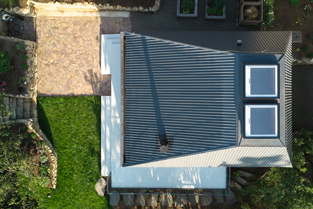 Výzvy se ujal architekt Martin Hajný, který navrhl stavbu atypického tvaru se seříznutou střechou. Důvodem byla minimalizace výšky i ohleduplnost vůči sousedům, kterým takto tvarovaná střecha nekazí výhled do krajiny. „Jakékoli vložení okna do jedné ze čtyř střešních rovin by narušilo jednoduchost domu, jak ho vidíme zvenku. Proto nás napadlo prosvětlit ložnici jinak – světlíky shora. Čím víc jsme se s klienty tou myšlenkou zabývali, tím víc se nám líbila. Vznikl zde zajímavý meditativní prostor. Člověk se vzbudí horním světlem, které ho nutí seběhnout dolů a dívat se velkými okny na výhledy do krajiny,“ vysvětluje své originální řešení Ing. Arch. Martin Hajný.