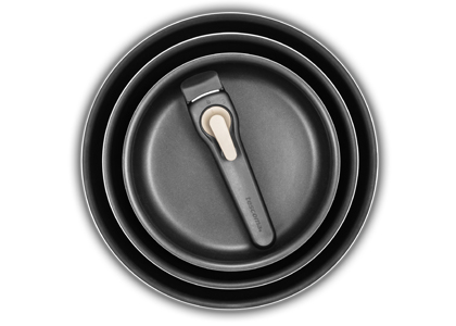 Je zajímavé tím, že k jedné sadě třech kastrolů nebo pánví náleží jen jediná univerzální rukojeť. Tři nádoby v sadě se tak skladují vzájemně v sobě s rukojetí vloženou na závěr do nejmenší z nich. S rukojetí se velmi snadno manipuluje a je díky dvoustupňovému bezpečnostnímu zámku naprosto spolehlivá. Další výhodou tohoto nádobí je prvotřídní antiadhezní povlak a možnost použití na všech typech sporáků i v troubě.