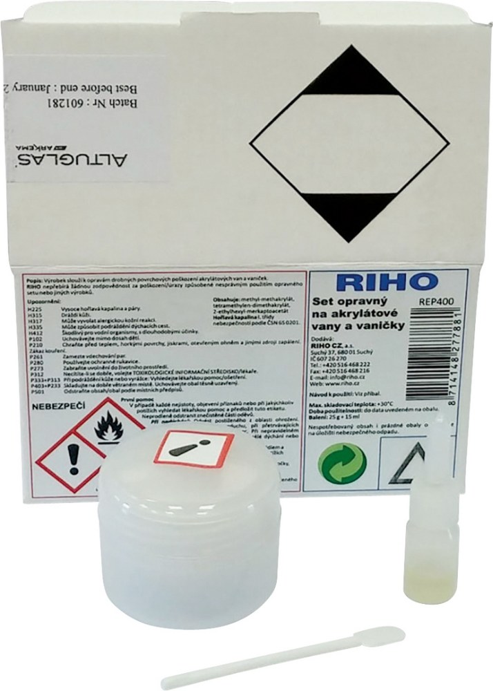 TIP: Opravný set na vany a sprchové vaničky Riho se skládá z tekuté složky vlastního metylmetakrylátu (organická sloučenina) a tekuté složky iniciátoru polymerační reakce doplněného ředidlem. Návod je součástí balení.