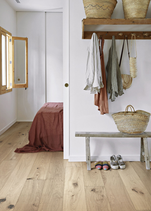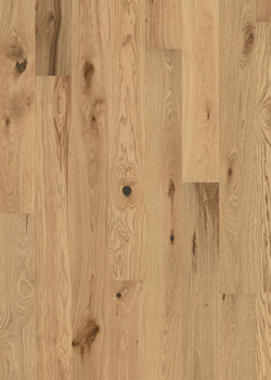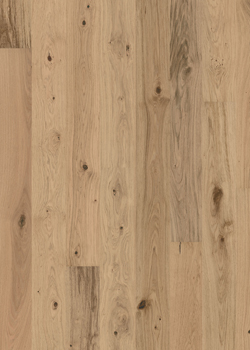 Světle béžový odstín podlahy Dub Gentian harmonizuje s tmavšími vlákny dřeva, suky a prasklinami, matný lakovaný povrch je kartáčovaný, aby více vynikla přirozená struktura dřeva.
